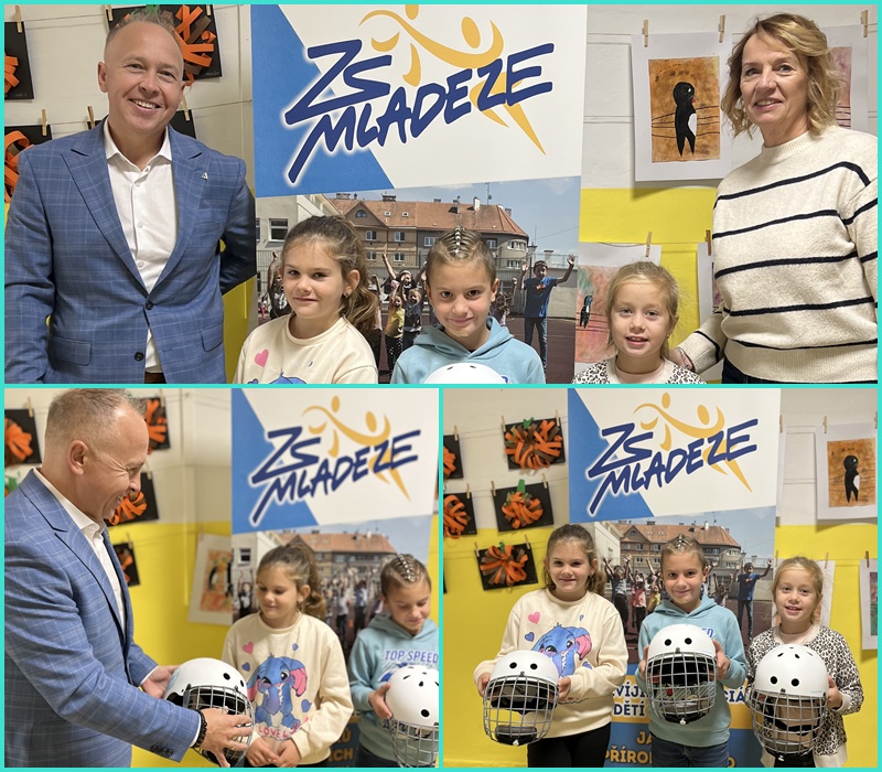 a za školu paní ředitelka Romana Loydová. Helmy mají sloužit zejména ke zvýšení bezpečnosti dětí a také pro lepší dostupnost projektu pro děti ze sociálně slabších rodin.